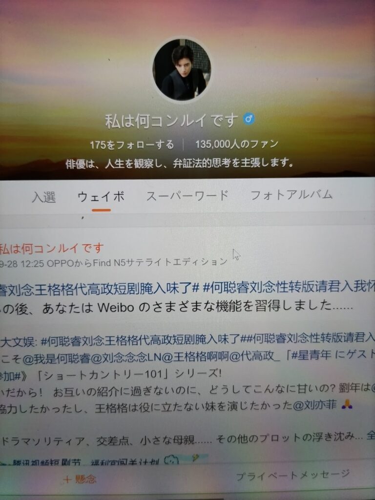 中国版「X」に当たる「Weibo」は「我是何聪睿」がアカウントのようです。