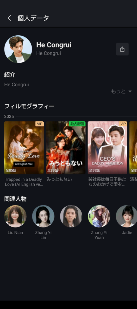 「iQIYI」は、俳優さんごとに出演するドラマと映画を検索することができます。