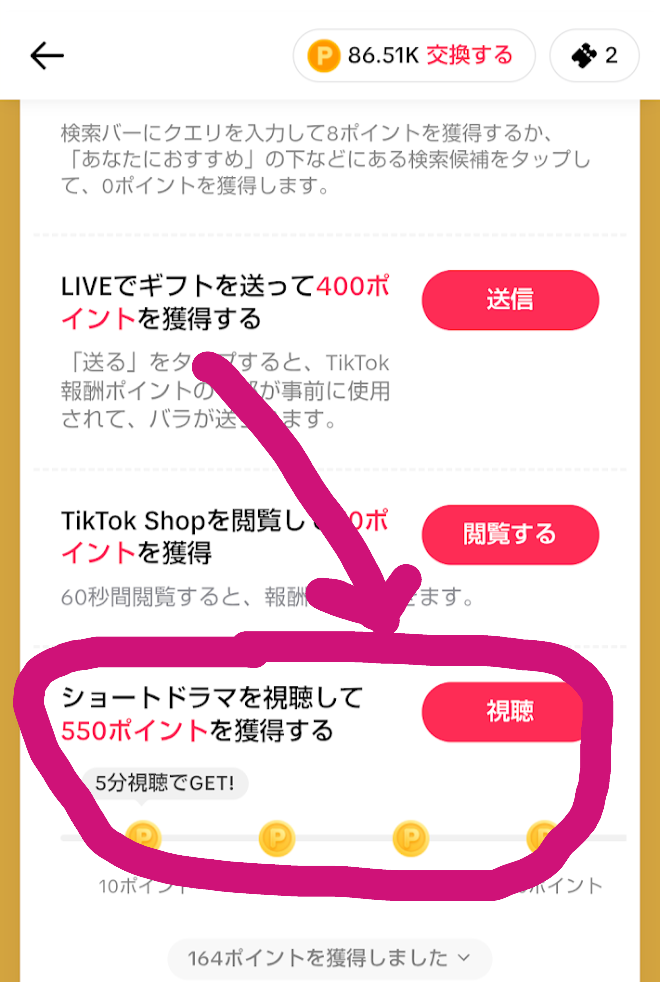 で、最近気づいたのですが、ショートドラマを観てもポイントがもらえるようになってました!