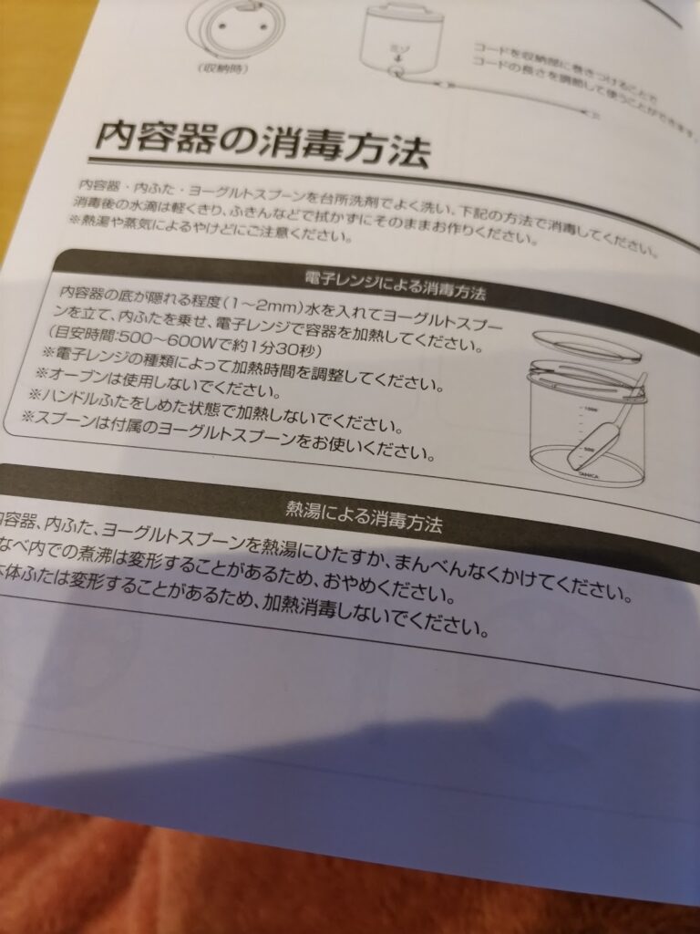 ヨーグルティアSの説明書には、熱湯をかけて消毒か、レンチンでもいいよって具体的に明確に記載してくださっていました。